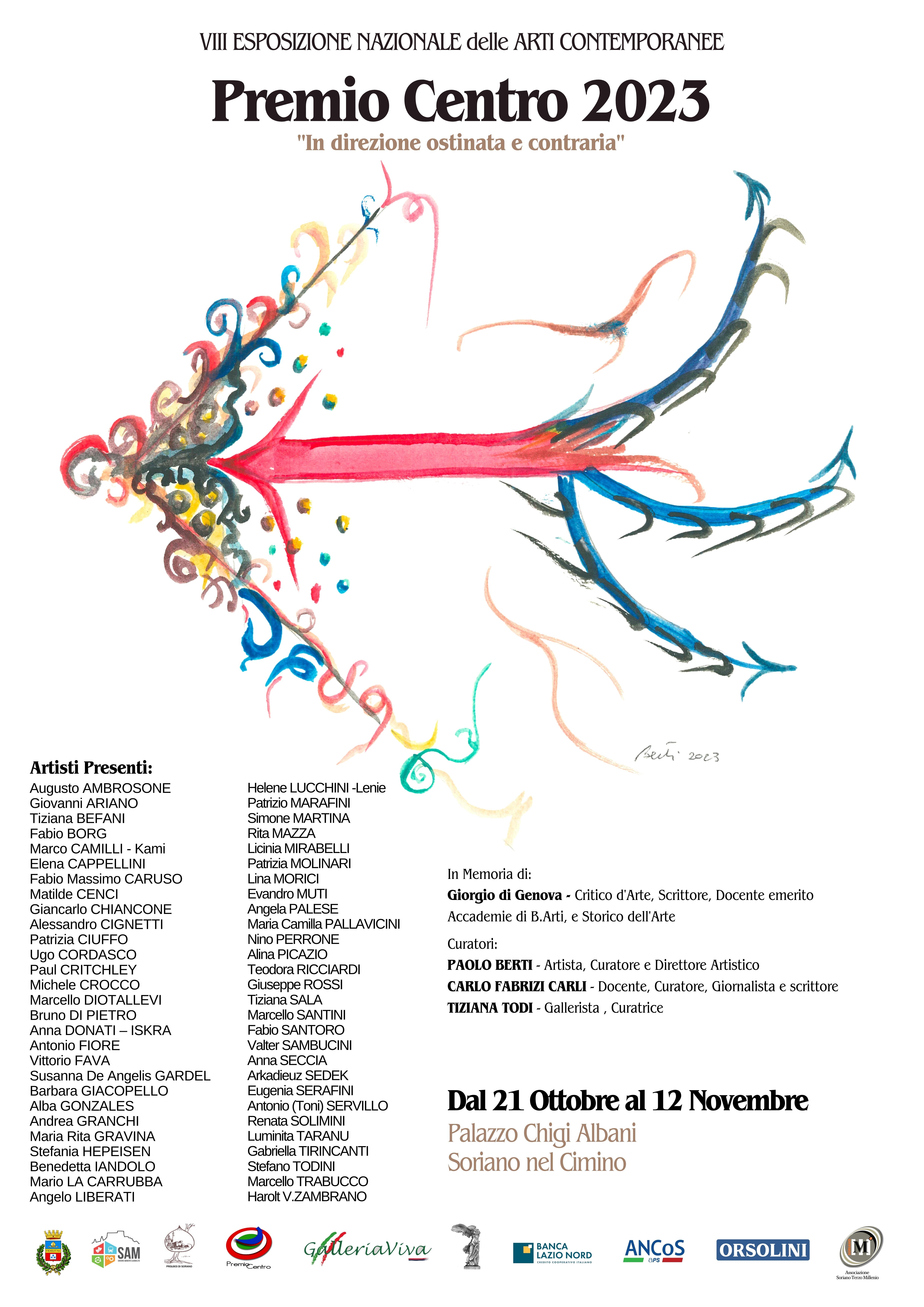 Pochi giorni ci separano dal 21 ottobre 2023, quando alle 17.00 si aprirà il grande portale del Palazzo Chigi Albani di Soriano nel Cimino, per l’inaugurazione del Premio Centro 2023. A maggio del 2023 Giorgio Di Genova fu entusiasta di intraprendere questo percorso, già di forte tradizione e si propose quale Curatore. Dinamico e intraprendente prese subito il timone di questa per lui nuova avventura e con la fermezza e chiarezza degli obiettivi, partecipò l’invito a collaborare e alla cura, anche a Guglielmo Gigliotti, Carlo Fabrizio Carli e Tiziana Todi, oltre al sottoscritto esperto del Premio. La sua morte, il 25 luglio scorso, ci ha lasciato sorpresi ed orfani. Il 19 luglio scrisse a Berti ammettendo la sua debolezza fisica ma garantì: ‘Il tempo c’è’ per indicare che avremmo comunque portato in porto questa sua e nostra avventura. E così abbiamo fatto, anche se in sua vece, come di certo avrebbe voluto. Ora siamo quasi arrivati, vediamo il faro e tra pochi giorni l’attracco al porto sarà tutto diretto da Giorgio e da noi perchè, in sua memoria e ricordandolo ogni momento da quel 25 luglio scorso in cui è scomparso, lo abbiamo testardamente preparato, come avrebbe voluto. Convinti della sua scontata presenza, apriremo tutti noi e i 53 artisti che hanno voluto condividere questa missione, la grande porta del Palazzo, perchè il benvenuto ce lo darà proprio lui, Giorgio Di Genova, a due giorni dal suo novantesimo compleanno, tra i suoi cari, i quadri, le luci, le musiche e le splendide sculture della Fonte Papacqua, invisibile e presente. Ne siamo certi. Non mancherà di esserci! Tra tutti noi e nel nostro ricordo”.