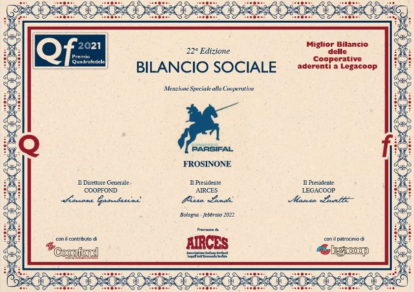 Il Consorzio Parsifal si è aggiudicato la “menzione speciale” nella cerimonia virtuale di premiazione di Quadrofedele, evento promosso da Airces – Associazione italiana revisori legali dell’economia sociale, nella sezione “Miglior bilancio sociale”. L’iniziativa, giunta alla ventiduesima edizione, ha l’obiettivo di premiare i migliori bilanci d’esercizio e sociali delle cooperative che aderiscono a Legacoop.