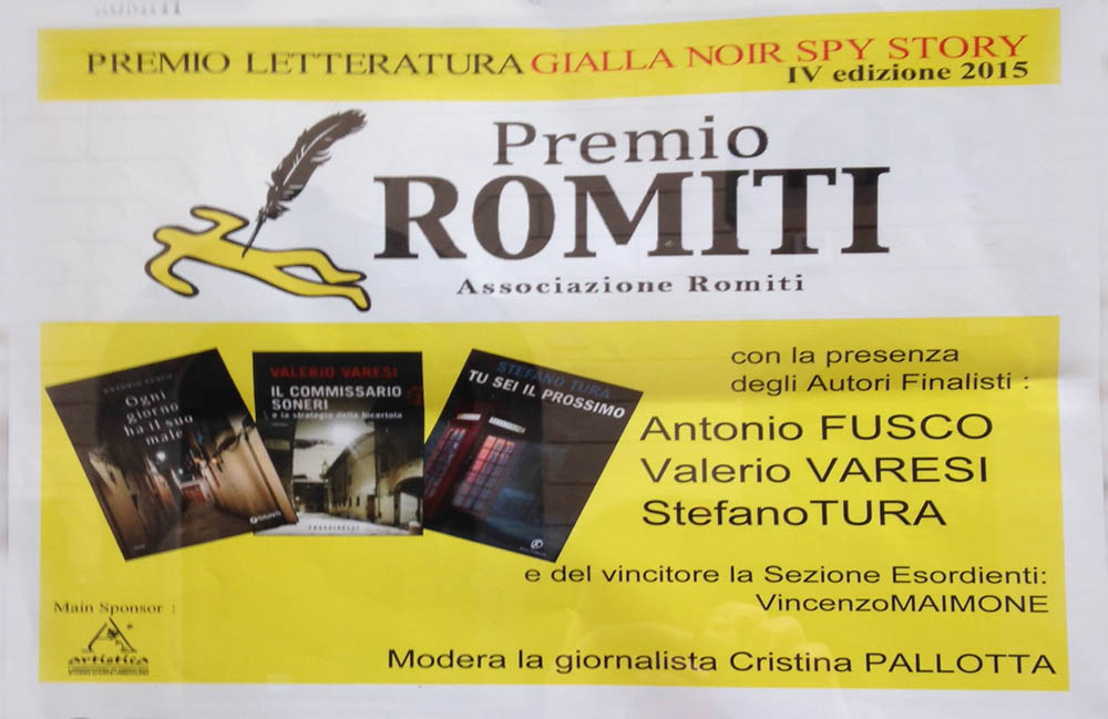 Antonio Fusco, Valerio Varesi, Stefano Tura e del vincitore della sezione esordienti Vincenzo Maimone,martedi 27 novembre alle ore 18 presso l’Aula Magna dell’Università della Tuscia in Via Santa Maria in Gradi, la quarta edizione anno 2015 del Premio Romiti. Modera la giornalista Cristina Pallotta www.associazionemarianoromiti.it
