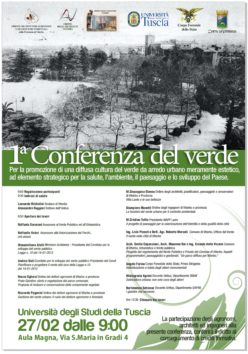 Prima Conferenza del verde il prossimo 27 febbraio all’Aula Magna dell’Università della Tuscia, a Santa Maria in Gradi. Ad annunciarlo sono Raffaela Saraconi e Raffaella Valeri, rispettivamente assessore al verde pubblico e all’urbanistica e assessore alla valorizzazione dei parchi e degli orti urbani. “Il Comune di Viterbo, l’Università degli Studi della Tuscia, il Corpo Forestale dello Stato e gli Ordini professionali degli agronomi, architetti e ingegneri di Viterbo e provincia hanno concordato e organizzato un importante appuntamento per la promozione della cultura del verde – spiegano i due assessori di Palazzo dei Priori -. Tra gli argomenti che verranno trattati e approfonditi nell’ambito dell’incontro si inseriscono i contenuti innovativi della legge 10/2013, le molteplici funzioni del verde, i giardini storici della nostra città, la situazione attuale ma anche le prospettive future. Non mancherà un intervento su Pratogiardino, con riferimento alla proposta di restauro e conservazione. Durante la prima Conferenza del verde si parlerà anche della tutela degli alberi monumentali, del regolamento comunale del verde pubblico e privato, con i relativi aspetti programmatori, paesaggistici e gestionali. Non ultimo, si discuterà del parco diffuso a Viterbo”. La Conferenza si aprirà con il saluto istituzionale del sindaco Leonardo Michelini e del rettore dell’Università della Tuscia Alessandro Ruggieri. Oltre agli assessori Saraconi e Valeri interverrà, tra gli altri, Maria Cristina Tullio, architetto e presidente dell’Associazione Italiana Architettura del Paesaggio Lazio.