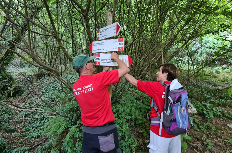 Oggi i Volontari del Gruppo Sentieri del CAI di Viterbo, insieme a quelli di Esplora Tuscia hanno completato il montaggio della segnaletica realizzata secondo gli standard nazionali del Club Alpino Italiano. I sentieri sono stati inseriti nel Catasto regionale e Nazionale della SOSEC (Struttura Operativa Sentieri e Cartografia del CAI).