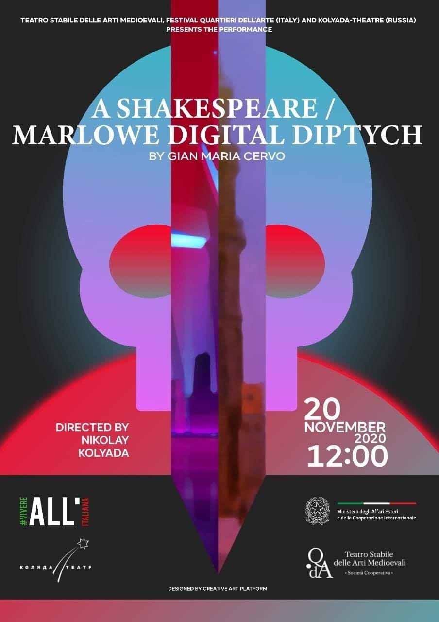 A Shakespeare/Marlowe Digital Diptych è un progetto cross-mediale bilingue nato dall’incontro del drammaturgo e curatore italiano Gian Maria Cervo e il regista e drammaturgo russo Nikolay Kolyada. Il dittico – che sarà recitato in russo e in italiano, con sopra-titoli in italiano e in inglese – si compone di due riscritture brevi, Amleto – un’Ofelia di Più e Musica o un altro nome per la tempesta, ed è un progetto promosso dal Ministero degli Affari Esteri e della Cooperazione Internazionale – Direzione Generale per la Promozione del Sistema Paese, in collaborazione con la Direzione Generale Spettacolo del Ministero per i beni e le attività culturali e per il turismo, nell’ambito del progetto Vivere all’italiana sul palcoscenico.