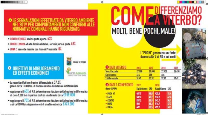 L’ Ing. Pierluigi Tortorella di Viterbo Ambiente ricorda che, dal 2012, quando cominciò la raccolta differenziata, ad oggi, sono stati raggiunti dei risultati impensabili. Ma oggi abbiamo bisogno di nuovi interventi. Soprattutto nel centro storico, è frequente il fenomeno degli abbandoni, materiale non differenziato che rappresenta il 55% in più della raccolta normale, ancora più offensivo per il decoro urbano.