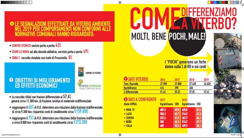 “Il nostro intervento ha un carattere fondamentalmente educativo e si basa principalmente, su due attività” spiega Claudio Torcolacci, consigliere CdA Viterbo Ambiente, “una campagna di comunicazione fatta attraverso 17 manifesti 6X3 affissi sul territorioil cui claim sarà:“Molti bene, pochi male” e pieghevoli da distribuire ai cittadini con lo stato quantitativo e qualitativo della raccolta differenziata sul territorio comunale. Previsti inoltre incontri divulgativi per fornire chiarimenti all’utenza attraverso un punto informativo, (si pensa ad un gazebo),svilupperemo una serie di incontri con la cittadinanza per evidenziare le criticità dei comportamenti”.