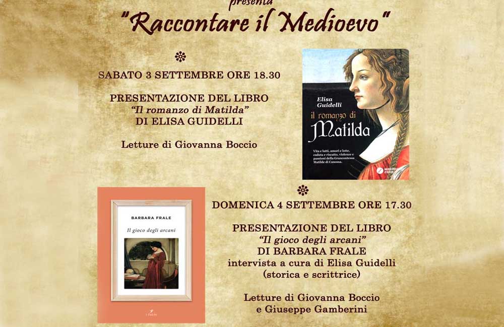 Si inizia sabato 3 settembre alle 18:30, in compagnia di Elisa Guidelli, che ci presenterà “Il romanzo di Matilda” (ed. Meridiano Zero), primo romanzo storico che ripercorre la vita della Grancontessa Matilde di Canossa. La vita, i lutti, gli amori, le lotte, la caduta, il riscatto, le violenze e le passioni di uno dei personaggi più affascinanti del Medioevo.