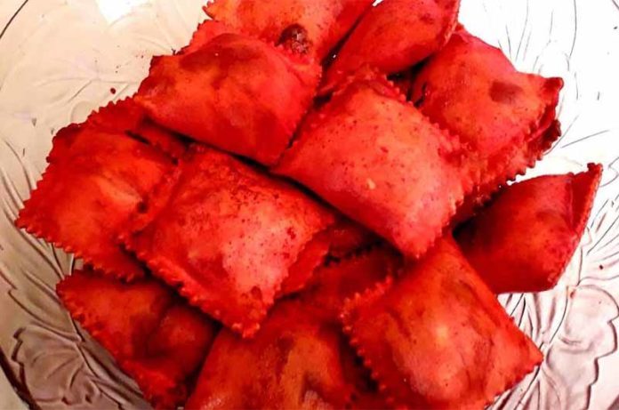 RAVIOLI DOLCI RICOTTA E ALCHERMES; per la pasta 5 uova, 500 g di farina 0, per il ripieno 600 g di ricotta fresca di pecora, un cucchiaino di cannella, 200 g di zucchero, mezza tazzina di alchermes, una bustina di vanillina, 2 uova, la buccia di un limone grattugiata : poi zucchero cannella e alchermes per l’esterno. Fate scolare bene la ricotta mettendola dentro un scolapasta per almeno un paio d’ore. Preparate la pasta impastando le uova con la farina, poi stendetela a mano o con una macchinetta per la pasta , con questa dose verranno circa 40 ravioli rettangolari. Preparare il ripieno mescolando la ricotta con le uova, l’ alchermes, la vanillina, lo zucchero ,la cannella e la buccia del limone grattugiata. Ora riempite uno ad uno i ravioli, fate in modo di sigillarli bene ai lati altrimenti potrebbero aprirsi durante la cottura. Disponeteli su una teglia  con della carta forno e infornate a 180° per 15 minuti circa. Sfornateli, fateli freddare, metteteli in una zuppiera e cospargete con cannella, zucchero e alchermes.