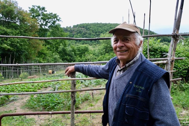 Scorgiamo numerose case-grotta ora chiuse con portoni fatiscenti di legno, serrate con il classico catenaccio che si usa dalle nostre parti, nascondono degli ambienti che in un passato non molto lontano erano abitate dai poveri contadini del posto. Siamo attratti da una casa attaccata alla parete di tufo che costeggia la strada, con una stupenda parete verticale di fichi d’india tutta pericolante, distinta dal numero civico 39. La porta è socchiusa e ci mostra un soffitto che sta cadendo a pezzi, un grosso focolare in mattoni e un tinello scavato nella adiacente parete di tufo usato per la conservazione del cibo, una ripida scala porta al piano superiore, lasciando immaginare che salirla doveva costituire l’ultima fatica della giornata per potersi poi coricare in un giaciglio ricavato da pannocchie di granturco. Segni rimasti di una vita dura che ha forgiato le generazioni che si sono succedute. Arrivati a valle, un ponticello in ferro abbandonato e ricoperto di rovi supera un fosso, ora attraversato dal un comodo passaggio in cemento, una piccola chiesa rupestre sulla sinistra ci da il benvenuto.Siamo giunti a Vetriolo chiamata “Voltarina” un borgo mignon dove un tempo prima dell’abbandono delle campagne abitavano circa otto famiglie di contadini. Ci addentriamo nel minuscolo borgo, dove grossi cartelli avvertono del pericolo di crolli, le piccole case che si affacciano ancora sulla stradina rimandano indietro nel tempo con la visione delle donne sull’uscio a chiacchierare e a setacciare il finocchio (Ferula communis) immancabile spezia che distingue il sapore nella tradizione della Tuscia a tavola. A pochi metri c’e la strada che una volta portava al torrente Rio Chiaro che scorre in fondo alla valle ma è impraticabile così decidiamo di ritornare sui nostri passi, una vigna ben curata con una ottima esposizione al sole e protetta dalle pareti della valle fa pensare che il posto non sia del tutto abbandonato ed è proprio risalendo il sentiero che facciamo la conoscenza dell’ultimo “abitante” del posto,Remo Seravalle con sua moglie Giuseppa lui classe ’42 e lei ’44 qui in questo posto ameno della Tuscia ci vivono preservando il loro ecosistema-E’ Remo che cura impeccabilmente la sua vigna,niente da meno l’orto che con grande orgoglio ci porterà a visitare. In questo viaggio di ritorno al passato, ci sediamo a chiacchierare , una narrazione che attraversa la sua vita, è nato proprio qui nella casa diroccata alla nostra sinistra, dove all’epoca non c’era luce e l’acqua bisognava andarla a prendere con la brocca al torrente e per poter cuocere il pane bisognava andare nel bosco a raccogliere le fascine di legna. Con una punta di malinconia tra se e se afferma che si si stava bene anche se mancava tutto. Ora ritorna a Voltarina per curare la vigna e l’orto come a voler perpetuare un legame antico che non si è mai interrotto. La valle con il suo silenzio il verde che ti circonda è come un ventre materno che ti accoglie e ti protegge. Uno scatto per fissare questa splendida giornata, sulla piccola rotonda in cemento dove durante le feste un tempo si ballava, segna la conclusione di un pomeriggio vissuto nella riscoperta di luoghi troppo spesso dimenticati, e pensare che poco più in là il faro Civita grande attrattore turistico catalizza tutte attenzioni su di se. Le storie del narratore Realino fluiscono senza farci accorgere che abbiamo superato la temuta salita, stanno a significare che Vetriolo può e deve essere una tappa obbligata con un narratore di comunità, la sua è una storia da recuperare e tramandare.