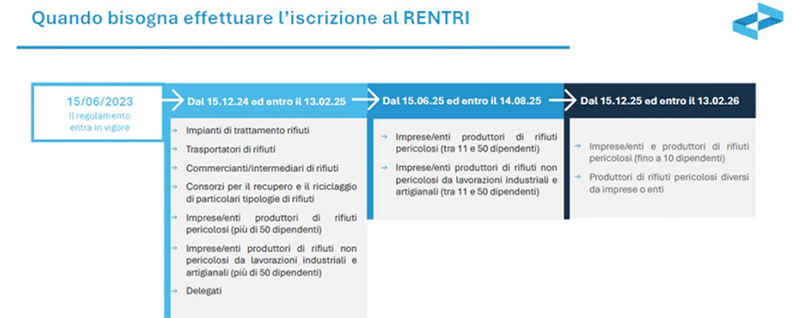 Premesso che, per i produttori iniziali di rifiuti, le attività del RENTRI potranno essere delegate alle associazioni di categoria come Confartigianato Imprese di Viterbo, di seguito comunichiamo un riepilogo degli adempimenti e delle tempistiche entro le quali essi dovranno verificarsi.