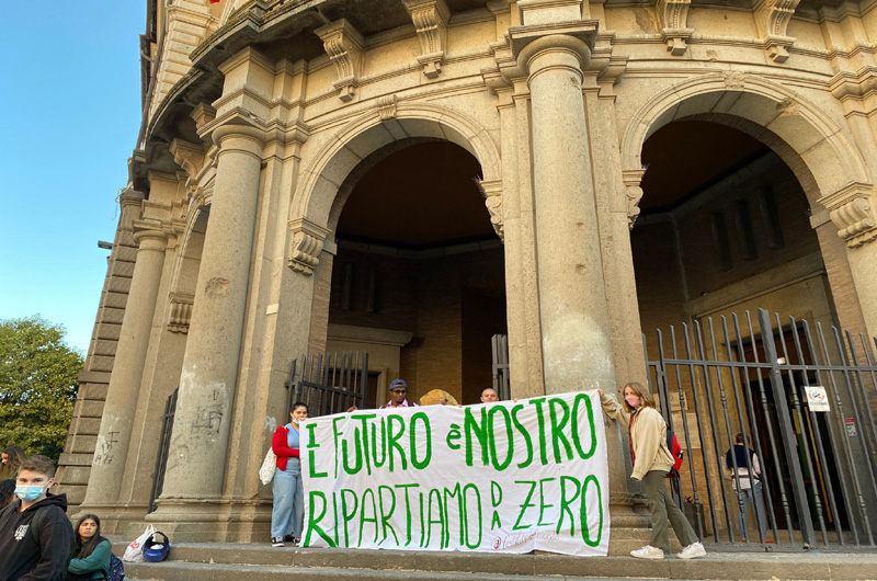Rete degli Studenti Medi, uno striscione con un messaggio chiaro e diretto: “Il futuro è nostro, ripartiamo da zero”