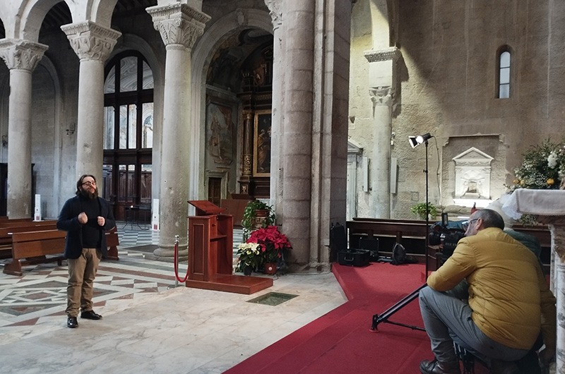 Le riprese del Palazzo dei Papi, sede della residenza e delle attività di Giovanni XXI durante il suo pontificato, si aggiungono a quelle degli ambienti interni della Cattedrale di San Lorenzo. Per l’occasione è stata inoltre aperta la porta della stanza che all’interno del Duomo custodisce il monumento funebre dedicato a Giovanni XXI, fortemente voluto dall’Ambasciatore portoghese a Roma, il Duca di Saldanha.