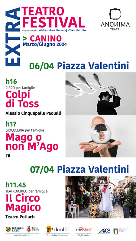 Questo fine settimana a Canino, in occasione della 22a Sagra dell’Asparago Verde IGP, un programma di teatro e circo per bambini, famiglie e tutte le età! Venerdì 5 aprile dalle ore 17 al Teatro Comunale L. Bonaparte arriva il leggendario principe dei ladri “Robin Hood” nello spettacolo di Loredana Parrella organizzato da Twain Centro Produzione Danza con il sostegno del Ministero della Cultura, della Regione Lazio e del Comune di Canino. Si continua all’aperto con tre eventi inseriti all’interno di Extra Teatro Festival, curato da Anonima Teatri e sostenuto dalla Regione Lazio e dal Comune di Canino. Sabato 6 aprile dalle ore 16 a Piazza Valentini, circo, giocoleria, monocicli e torce infuocate con “Colpi di Toss” di Cinquepalle, a seguire l’ironica e poetica magia contemporanea di Fil con “Mago o non M’Ago”. Domenica 7 aprile alle ore 11.45 parte da Piazza Valentini la passeggiata del Teatro Potlach intitolata “Il Circo Magico” con trampolieri, percussioni, danze e racconti.