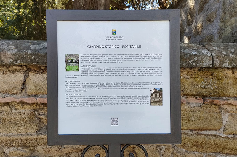 Si tratta nello specifico di otto pannelli turistici, di cui sette (50×50 cm) collocati in prossimità dei monumenti, e uno (100×120 cm) di benvenuto, con cartografia artistica a volo d’uccello disegnata a mano dallo stesso Cecchini sullo stile di quelle già realizzate e installate a Viterbo, Bagnaia e San Martino al Cimino. Tutti i pannelli sono dotati di QR code – spiega Cecchini nella relazione di chiusura dei lavori fornita al Comune di Viterbo -. I pannelli installati sui monumenti hanno sullo sfondo, in semitrasparenza, la foto dello scorcio in cui è inserito il pannello stesso, ciò allo scopo di armonizzare la visione d’insieme tra gli elementi architettonici che si intravedono, seppur sfumati, nello sfondo del pannello, i quali richiamano quelli reali dello scorcio paesistico.