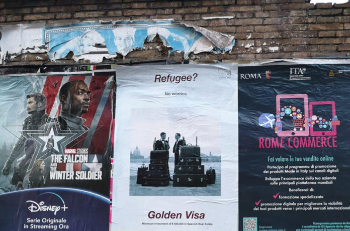 “A quel paese”,è l’interessante mostra organizzata dalla Fondazione Baruchello e la Real Academia de España, la serie di manifesti di Rogelio López Cuenca affronta il tema della migrazione con i linguaggi tipici della pubblicità.La prima retrospettiva italiana. olden Visa è uno degli step di cui si compone la mostra, le cui opere sono installate presso la Fondazione Baruchello, la Real Academia de España e lo spazio pubblico. L’esposizione nelle sedi della Fondazione e della Real Academia si compone di pitture, installazioni, video, testi editoriali che trattano i temi ricorrenti della poetica e della ricerca di López Cuenca, ovvero il viaggio, le politiche migratorie, la memoria storica, la speculazione urbana e la spettacolarizzazione della cultura in funzione del turismo.I manifesti di estremo interesse sono esposti nelle zone strategiche della Capitale, in 250 esemplari, dal 22 aprile all’1 maggio e in successione altrettanti tra il 4 e il 13 giugno.