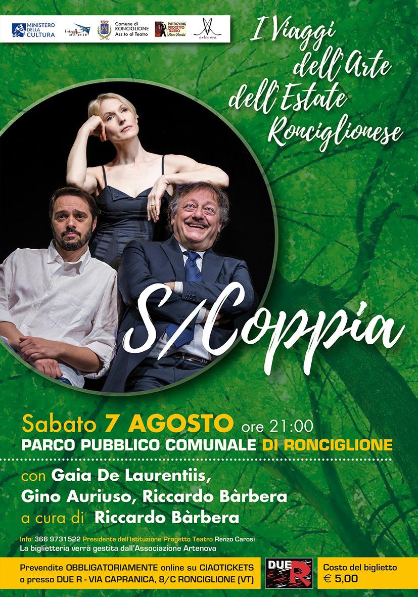 Prosegue con successo a Ronciglione la rassegna “I viaggi dell’arte dell’estate ronciglionese”. Al parco “Don Pacifico Chiricozzi” sabato 7 agosto alle 21.00 va in scena “S/coppia-D/Istruzioni per l’uso”, protagonisti e interpreti Gaia De Laurentiis, Gino Auriuso e Riccardo Bàrbera. I tre sono i protagonisti di un’indagine divertita e insieme semiseria sulle origini e i destini (incerti?) della forma più misteriosa, potente, instabile e duratura di rapporto umano: la coppia.