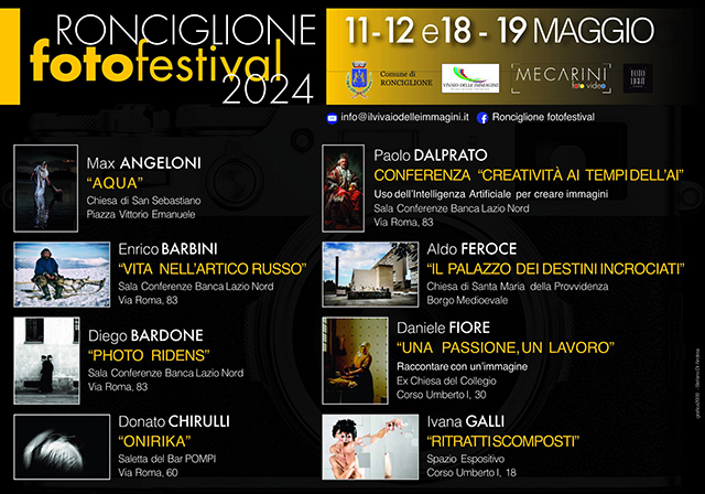 Un festival tutto dedicato all’immagine fotografica nelle sue molteplici espressioni, che coinvolgerà fotografi professionisti ed amatoriali in una kermesse ricca di incontri, mostre, eventi e workshop dislocati in alcune delle cornici più suggestive e conosciute di Ronciglione.
