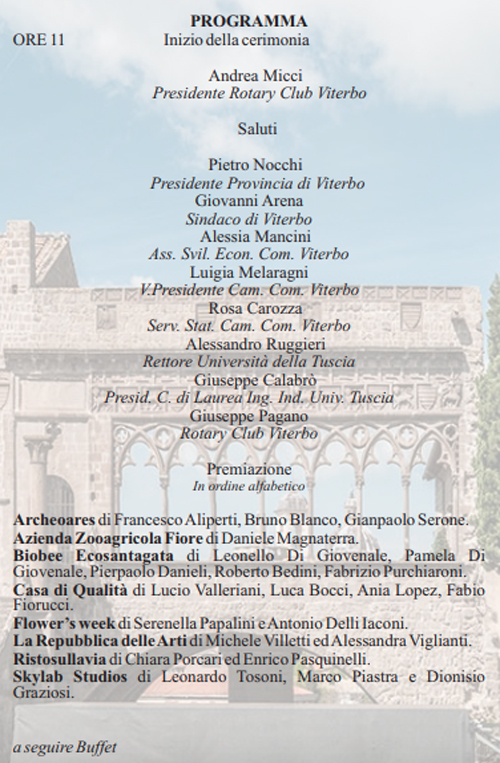 Nel corso della cerimonia, dopo i saluti del Comandante dell’Aeroporto, del Presidente del Club Rotary di Viterbo Avvocato Andrea Micci, del Sindaco di Viterbo e del Presidente della Camera di Commercio, la dr.ssa Rosa Carozza del Servizio statistico della camera di commercio traccerà un sintetico quadro statistico/economico della realtà imprenditoriale viterbese. Successivamente saranno proiettati brevi video di presentazione delle Imprese convocate, alle quali i rappresentanti delle Associazioni di Categoria consegneranno le targhe premio. Al termine, sarà servito un buffet.