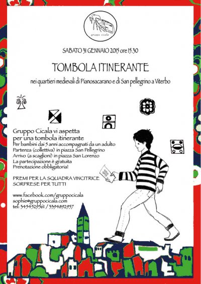I festeggiamenti per il nuovo anno continuano per i più piccini. Nell’ultimo giorno di gennaio il Gruppo Cicala con la partecipazione dei negozianti dei quartieri medievali di Pianoscarano e di San Pellegrino a Viterbo, organizza una tombola itinerante per bambini dai 5 anni accompagnati dai genitori. La partecipazione e’ gratuita. Come si svolge la tombolata? Alla partenza in piazza San Pellegrino, saranno formate delle squadre. A ognuna di loro sarà data una cartella con dei simboli misteriosi e una mappa con dei puntini indicando la posizione dei negozi partecipanti. Ogni negoziante avrà un simbolo da mostrare e se quest’ultimo è presente nella cartella della squadra darà lo stesso simbolo in piccolo da incollare sopra la cartella. E così via finché la cartella non sarà completa. Vincerà la squadra che giungerà per prima all’arrivo in piazza San Lorenzo con la cartella completa. Altre sorprese aspettano i partecipanti!