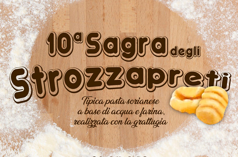 Il piatto forte saranno ovviamente i famosi strozzapreti (tipica pasta sorianese a base di acqua e farina, realizzata con la grattugia), ma sarà possibile gustare anche tanti altri prodotti come le bruschette miste, l’antipasto all’italiana, la sella di maiale al forno con crema di verdure, la carne alla brace e molto altro, il tutto accompagnato da birra e dai migliori vini della zona. Ovviamente sarà presente musica dal vivo che animerà l’evento nella bellissima cornice del Piazzale Enrico Berlinguer. Inoltre ci sarà un bellissimo “Raduno auto e moto Costum” presso Piazza Vittorio Emanuele II.
