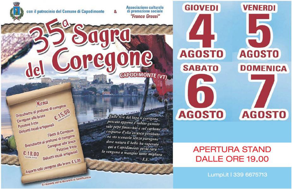 Per i visitatori sarà la buona occasione per gustare il coregone del lago di Bolsena nelle sue varianti più note: le “penne al sugo di coregone”, il “coregone alla brace” con un equilibrio di sapore perfetto delle erbe aromatiche utilizzate per la cottura e il “coregone marinato”.