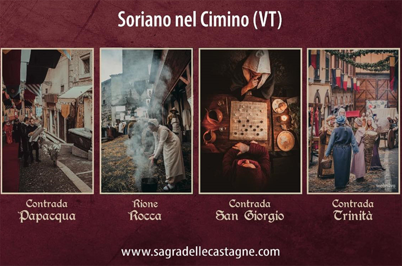 Sarà la 58esima edizione, della sagra storica della provincia di Viterbo, organizzata dal Comune di Soriano nel Cimino sotto l’egida dell’Ente Sagra con il Presidente Antonio Tempesta,dedicata a sua maestà la castagna. Gli organizzatori scoprono le carte pubblicando sul sito il programma decorrente dal 3 ottobre, consecutivo su tre fine settimana, fino al 19 ottobre.Chiaramente in attesa del perfezionamento finale viene definito “provvisorio”.