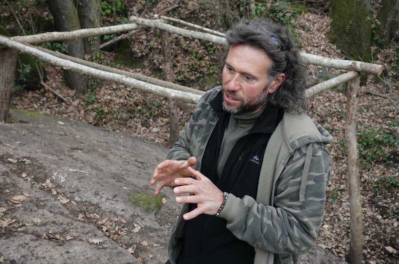 Caratteristiche che emergono in questo percorso in cui molto naturalmente il contadino sapiens come qualcuno lo ha definito, riesce a trasmettere questo ritrovato rapporto con la natura, con l’esposizione di un ambiente di cui conosce ogni dettaglio, ed è così che la sua narrazione diventa interpretazione del posto, Fosci non è semplicemente la nostra guida, ma il nostro novelliere, man mano che scendiamo nella valle sottostante, parla di un mondo abitato da animali di cui conosce la specie dai suoni e dai rumori , ci spiega cosa siano le “pestarole” usate per la produzione del vino, fornendo l’interpretazione di quei segni lasciati da chi è vissuto qui dal neolitico, al medioevo fino ai giorni nostri.