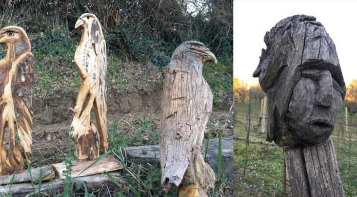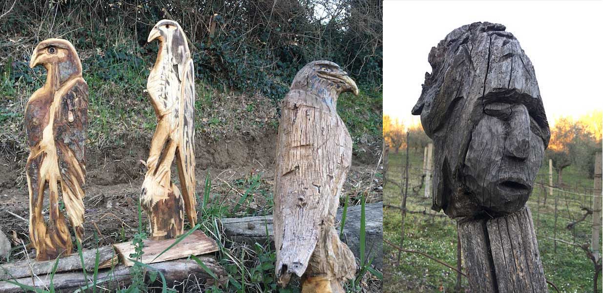 Inoltrandoci nella valle siamo arrivati all’antica necropoli di di Santa Cecilia dove i resti di una chiesetta del dodicesimo secolo probabilmente dedicata al culto della santa, ci lascia a vedere ancora parte della sagoma dell’abside, emergono i ruderi di cimitero dove sono ancora visibili croci scolpite in rilievo e sepolture ricavate nella pietra a forma umana, qui è evidente la sovrapposizione di varie epoche storiche testimoniate anche da cippi funerari che Fosci ci fa scorgere addentrandosi nella vegetazione. Ritornando sui nostri passi scopriamo un’altra passione di questo uomo, intagliare il legno, arte che gli è affine, con un tratti netti e decisi riesce a tirare fuori figure di animali che lo circondano: gufi, falchetti, cinghiali, quel mondo che sente suo in ogni espressione e lo delinea come fosse una fotografia.