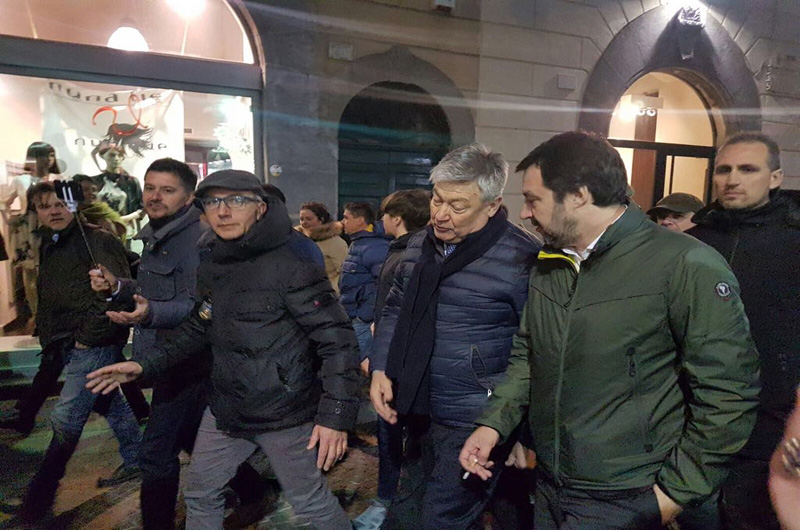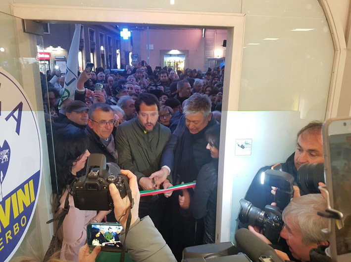 Eolo che gonfia le gote, una tramontana siberiana tale da far presagire un flop ed invece il nuovo e galvanizzato popolo della Lega rende calorosa la serata viterbese. Corso Italia, senza lo struscio d’un tempo, si rivitalizza con Matteo Salvini che, confuso in uno strascico di folla, prova a raggiungere piazza del Comune per l’appuntamento finale del suo tour cittadino. Ha già visitato quel che resta delle storiche Terme Inps, ha dovuto saltare il previsto passaggio a Prato Giardino, ha inaugurato la sede del movimento in piazza del Teatro, ha stretto centinaia di mani e firmato decine di autografi, ha rubato qualche boccata di fumo da chi, lungo il tragitto, gli ha passato di tanto in tanto una sigaretta. Un bagno di folla di altri tempi, che le raffiche di vento gelido non sono riuscite ad arginare. Gli è a fianco Umberto Fusco appena sbarcato a palazzo Madama: il senatore gli indica luoghi, gli ricorda vicende, gli nomina personaggi. E’ lui il cicerone con il leader della Lega. Sotto il Comune un palco gigantesco con i tanti responsabili del movimento e, sotto, simpatizzanti e magari semplici curiosi che occupano almeno metà della piazza. Una piazza che cresce di temperatura (e per fortuna) con l’incedere del comizio. Temi noti perché più volte affrontati in campagna elettorale e che nella circostanza vengono ribaditi. “Ho preferito venire a Viterbo che andare nello studio di Bruno Vespa”. La Lega nel capoluogo della Tuscia ha conquistato un rotondo 20% di preferenze ora però l’asticella va alzata. Salvini indica i prossimi due obiettivi. Lui li ha chiamati “sogni”: “Tornare a Viterbo da premier il 3 settembre per la festa di Santa Rosa e a maggio per salutare il primo sindaco della Lega”.