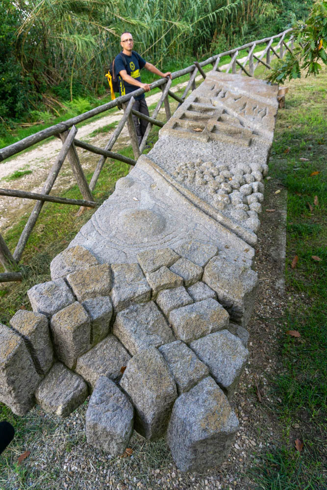 Riprendendo il cammino seguendo le orme di Sigerico ci imbattiamo in una scultura ben incastrata in una vecchia sorgente. 300.000 anni in 344 centimetri “Arte sui cammini” di Elena Mazzi in collaborazione con Regula Zwicky l’artista di origini Svizzere, da anni si e trasferita nella Tuscia, dove vive e lavora. La scultura è un succedersi di superfici e forme nate dai diversi fenomeni di raffreddamento delle lave che intervallano le varie epoche geologiche, lette in modo originale e creativo da Regula Zwicky.
