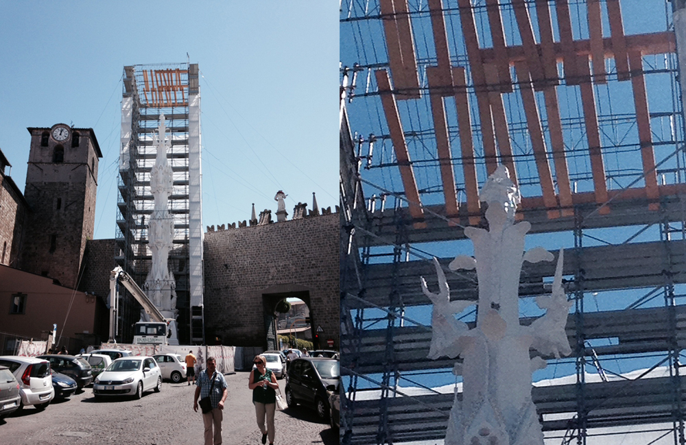 Questa mattina alle 11 come da programma a San Sisto, è stata sistemata la statua di Santa Rosa in cima a Gloria, la Macchina che proprio da San Sisto partirà per attraversare le vie della città il prossimo 3 settembre. La statua di Santa Rosa ha già ricevuto la benedizione del vescovo Lino Fumagalli lo scorso lunedì. In questi giorni non è stato possibile ultimare l’assemblaggio a causa del forte vento, questa mattina finalmente si è potuto procedere. Alla presenza sempre di un folto pubblico di viterbesi appassionati, del presidente della Provincia Mauro Mazzola, del presidente del Sodalizio Massimo Mecarini e di una delegazione di Facchini è avvenuto l’atto di completamento del montaggio.