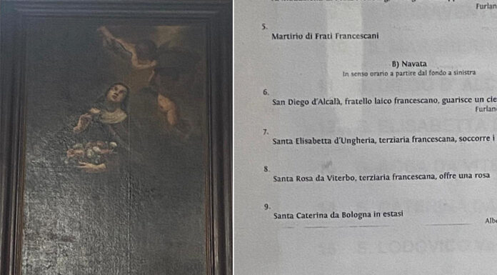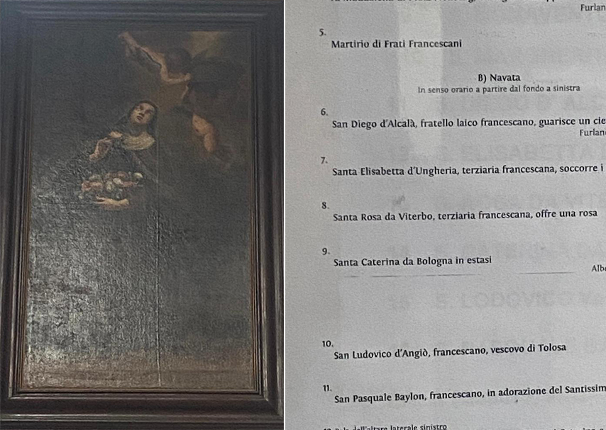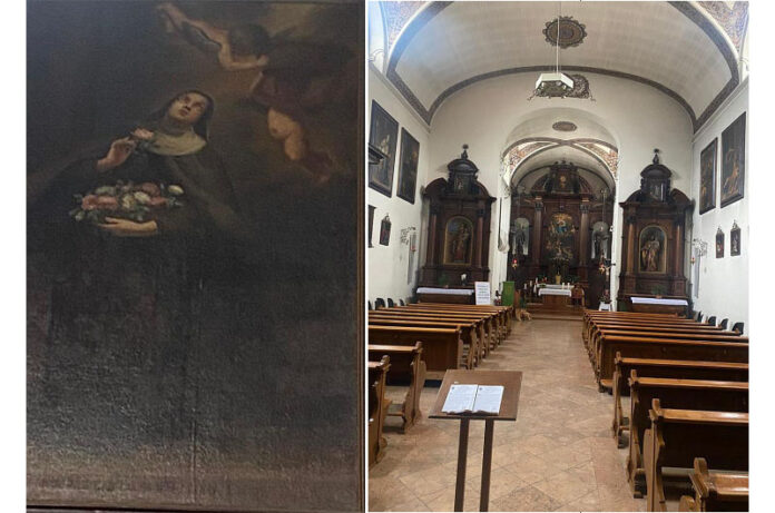 E’ stato Antonio Tempesta, presidente dell’Ente Sagra di Soriano nel Cimino, negli ultimi giorni di vacanza a Cavalese  prima di cominciare i preparativi per la kermesse sorianese a scoprire il quadro. Entrando nella Chiesa dell’Assunta a Cavalese, nella navata dal fondo a sinistra si trova un olio di importante grandezza il cui titolo è “Rosa da Viterbo, terziaria francescana, con una rosa in mano”.