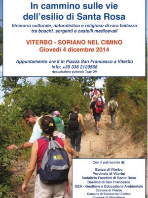 Giovedì 4 dicembre torna il cammino sulle vie dell’esilio di Santa Rosa una giornata di trekking da Viterbo a Soriano nel Cimino attraverso un itinerario culturale, religioso e naturalistico di rara bellezza tra boschi, sorgenti e castelli medioevali. Rievocazione dell’esilio di Santa Rosa da Viterbo avvenuto il 4 dicembre 1250 (antivigilia di San Nicola) e descritto sulla Vita I (primo processo di canonizzazione della Santa).
