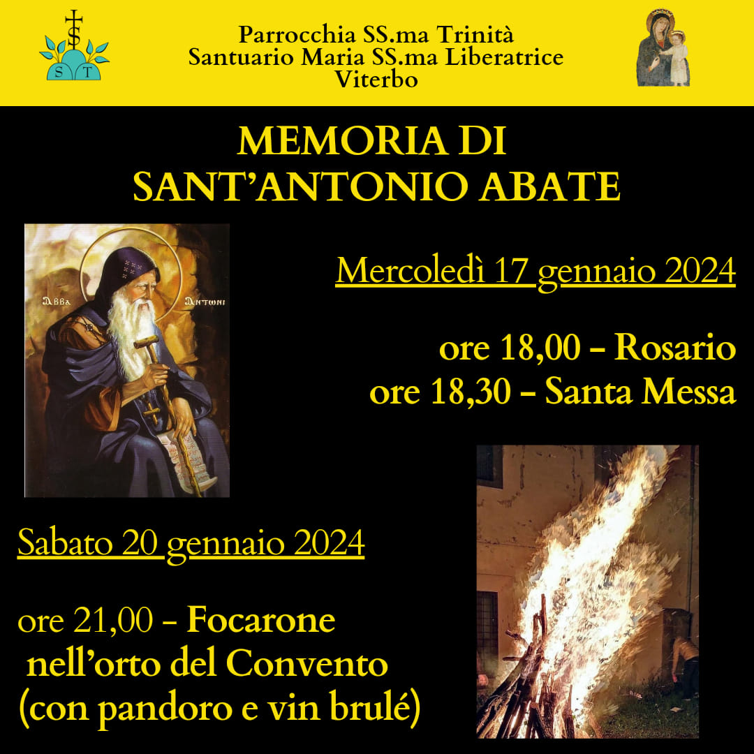 Presso il bellissimo complesso della Trinità, a Viterbo, la festa di Sant’Antonio Abate prevede due momenti: mercoledì 17 gennaio celebrazione liturgica alle ore 18.30, mentre sabato 20 gennaio, nello strepitoso orto del convento, alle ore 21.00, con degustazione di pandoro e vin brulè.