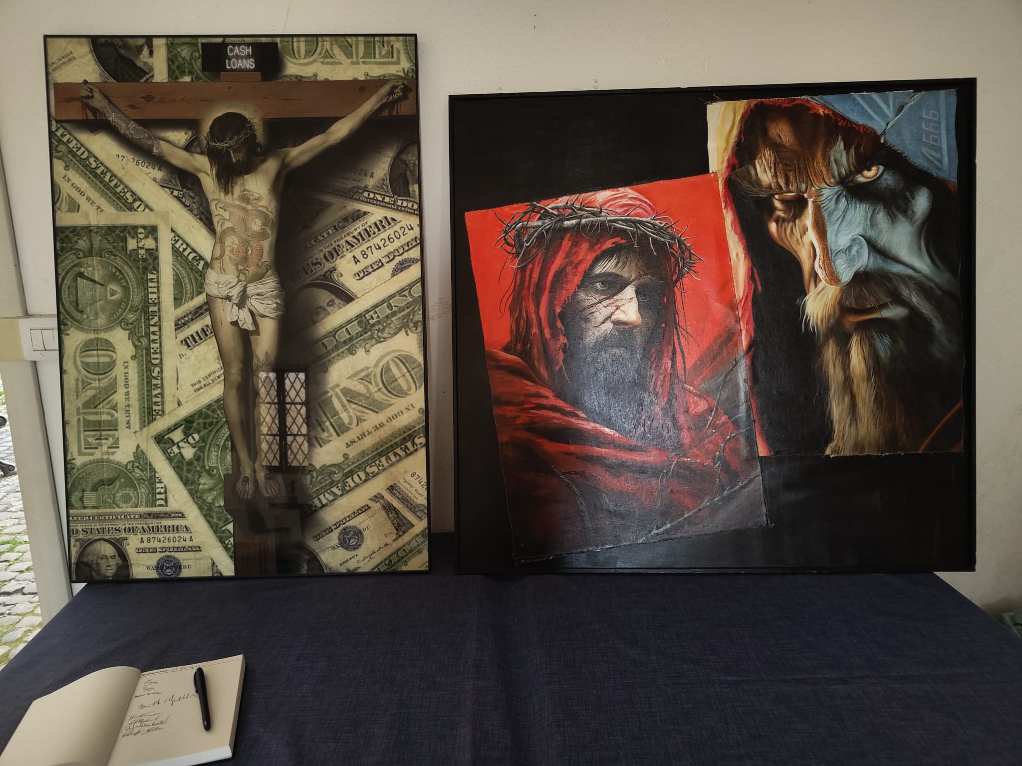 Massimo Stefani, Pres. degli Arcaisti ha selezionato le opere degli aritsti del Movimento: “Il bene e il male” dipinto con il Cristo e il Diavolo di Cesare Pinotti, “Madonna” scultura in pietra chiara e base in legno di Luigino Camedda e “Business Man” opera con il Cristo in Croce e i Dollari di Igor Lercher.