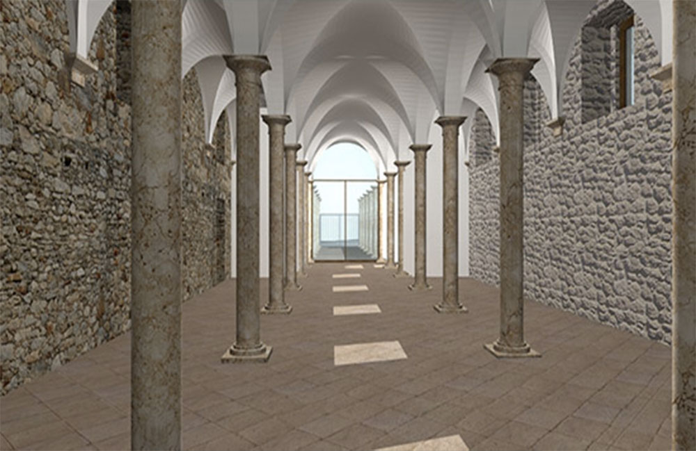 Il progetto prevede la riconfigurazione dello spazio interno delle Scuderie, coperte a volte a crociera su colonne, per la profondità di 7 campate nella zona Sud e la ricostruzione di una porzione del piano superiore, utilizzando la notevole quantità di materiale lapideo derivato dai crolli, per documentare l’altezza e la configurazione dell’edificio bramantesco e avere ulteriori spazi utilizzabili. La zona Nord rimarrà scoperta, come un sito archeologico, consentendo però di percepire dall’interno la profondità complessiva dell’edificio originario lungo 63 metri, ricollocando in sito tutte le sue 24 colonne monolitiche di peperino alte quasi 5 metri, preliminarmente ricomposte tramite anastilosi.