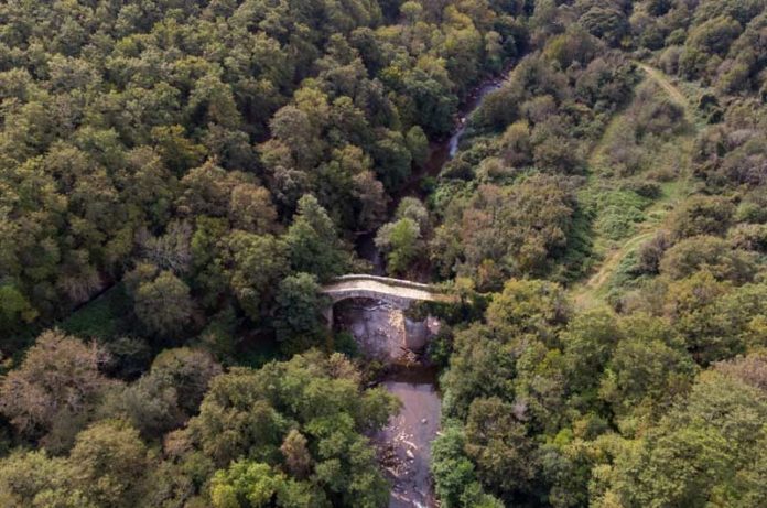 Da qui si attraversa un bellissimo bosco di querce e cerri, si arriva a uno spiazzo dove si possono ammirare delle grotte molto grandi, alte vari metri e molto profonde, con antiche iscrizioni all’interno. Di certo si sa che furono utilizzate come abitazioni e ricovero per animali, perché ci sono vari segni e date risalenti al XVII secolo. Riprendendo lo stesso sentiero si ritorna nello stradone che conduce sotto il castello seicentesco, chiamato castello nuovo di Rocca Respamapani. Il possente edificio ad un primo sguardo ricorda più un palazzo nobiliare, specie per la sua maestosa facciata principale, racchiusa da due “torri” a guardia del ponte chiamato di Fra Cirillo, che attraversa il fiume Traponzo.. Il paesaggio contraddistinto da pascoli e vaste boscaglie è selvaggio, misterioso e fuori dal tempo. Dopo aver ammirato il possente castello si inizia a scendere lungo la strada alle spalle dello stesso, fino al fiume dove si può camminare sul basolato dello splendido ponte fatto costruire Fra Cirillo Zabaldani nel XVI secolo. Nelle vicinanze del ponte, sul sentiero che conduce alla Rocca Vecchia, si possono ammirare delle interessanti formazioni geologiche di ignimbriti tefritico-leucitiche, caratterizzate da inclusi lavici e scorie, legate all’attività di emissione del Distretto Vulcanico Vulsino. Ritornando indietro, in parte sullo stesso sentiero, si raggiuge ancora la Rocca Nuova, da dove attraverso una strada carrabile si farà ritorno al centro dell’azienda agricola, completando il percorso ad anello.