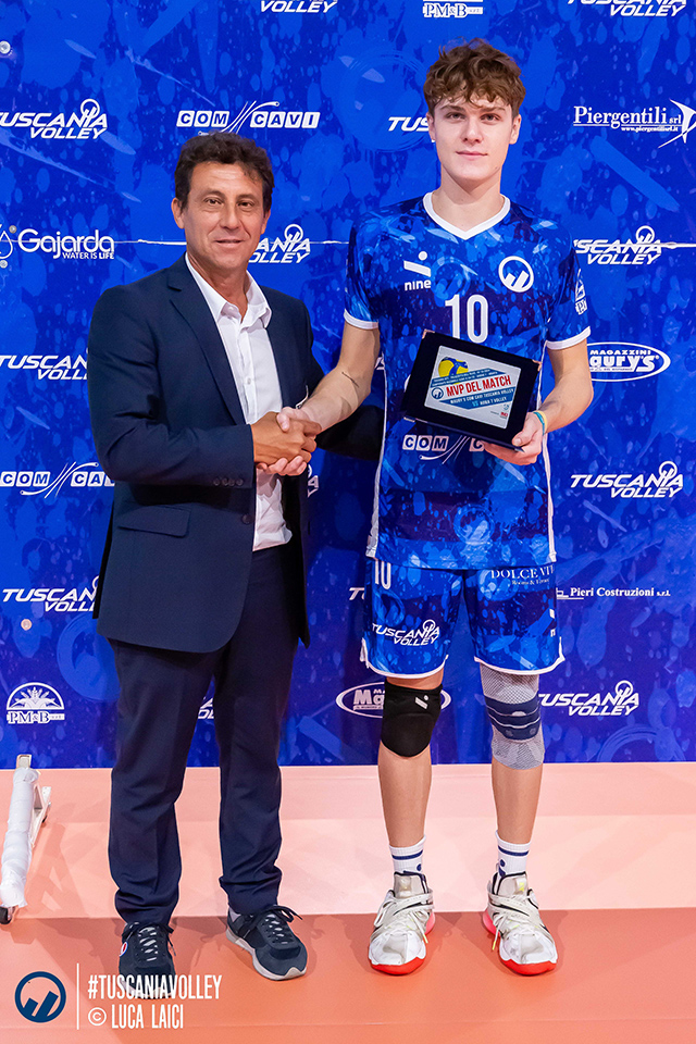MVP: Claudio Borzacconi premiato dal presidente del Tuscania Volley Massimo Pieri.