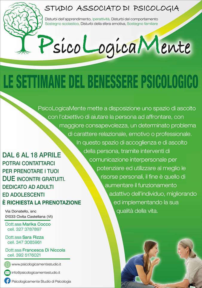 Proprio per questo lo studio Psicologicamente lancia le Settimane del benessere psicologico dal 6 al 18 aprile a Civita Castellana presso la sede dello studio in via Donatello. Sarà possibile contattare gli psicologi dello studio per prenotare due incontri gratuiti dedicati ad adulti e adolescenti.