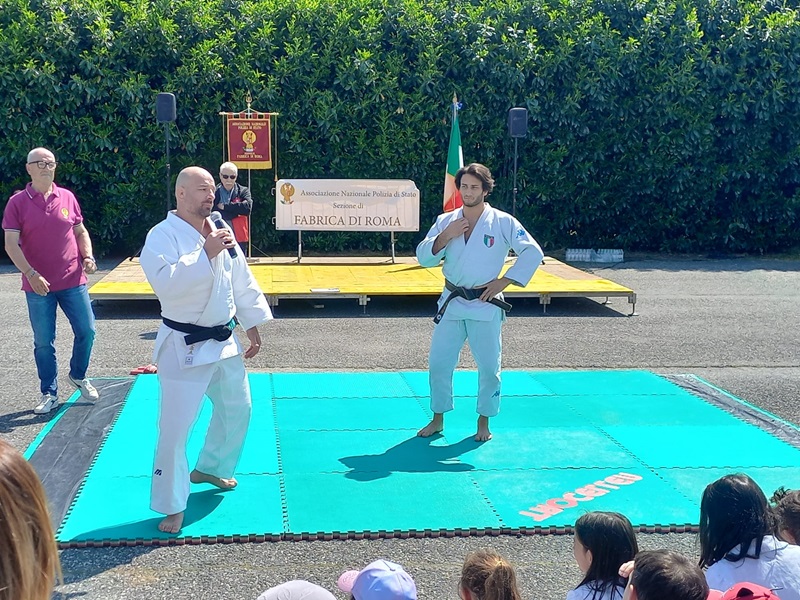 Elio Verde, più volte salito sul podio dei mondiali di Judo e il giovane Luigi Centracchio, anche lui medagliato durante i recenti mondiali di categoria, entrambi in forza al gruppo sportivo Fiamme Oro della Polizia di Stato, sotto lo sguardo attento del maestro Petti del club Yama Bushi di Fabrica di Roma -che ha collaborato all’iniziativa- , hanno mostrato alcune mosse di Judo insegnando anzitutto il profondo rispetto dell’avversario che è alla base di questa disciplina olimpica.