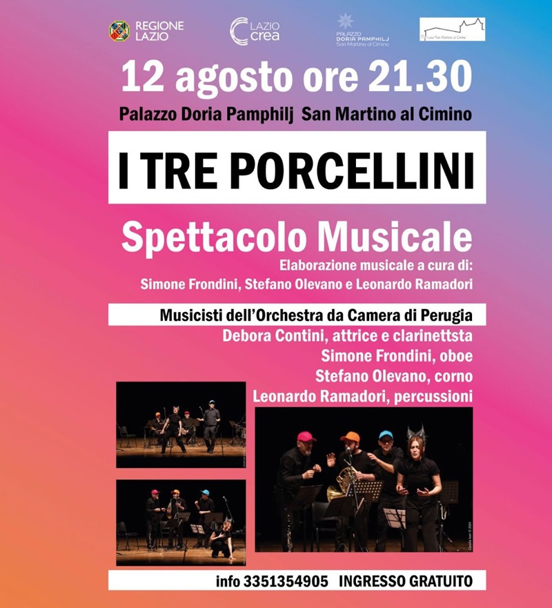 Lunedì 12 agosto alle ore 21.30, si aprirà il festival con “I Tre Porcellini”, un’elaborazione musicale curata da Simone Frondini, Stefano Olevano e Leonardo Ramadori, musicisti dell’Orchestra da Camera di Perugia. Debora Contini, attrice e clarinettista, sarà accompagnata da Simone Frondini all’oboe, Stefano Olevano al corno e Leonardo Ramadori alle percussioni.