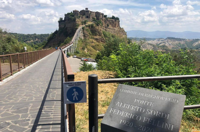 Alberto Sordi con la sciarpa bianca al vento e la città che muore alle spalle.A Civita di Bagnoregio l’attore girò un film, interpretando uno dei suoi personaggi più significativi,  diretto da Luigi Zampa  si chiamava ‘Contestazione generale’. Federico Fellini invece ha girato nelle contrade di Bagnoregio uno dei suoi film più importanti, ‘La strada’il film che nel 1954 si aggiudicò l’Oscar.Un legame che andava suggellato e da da martedì 4 agosto il ponte che collega il centro storico all’abitato della suggestiva frazione che sino a prima di quella data non aveva un nome è intitolato proprio a Sordi e Fellini, amici insperabili prima ancora che giganti del cinema internazionale. La Ripartenza è proprio da quel ponte cheoggi mette al  centro il cinema e il suo legame con Civita di Bagnoregio rendendolo  immortale.