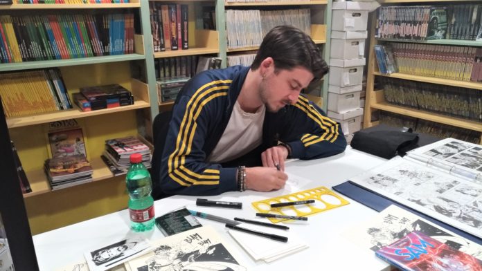Il ragazzo, classe 1991, ha intrattenuto il nutrito pubblico con le sue creazioni artistiche, nel particolare quelle tratte dal quinto numero di “Orfani – Sam”, dove i suoi disegni sono stati affiancati dai testi di Michele Monteleone.