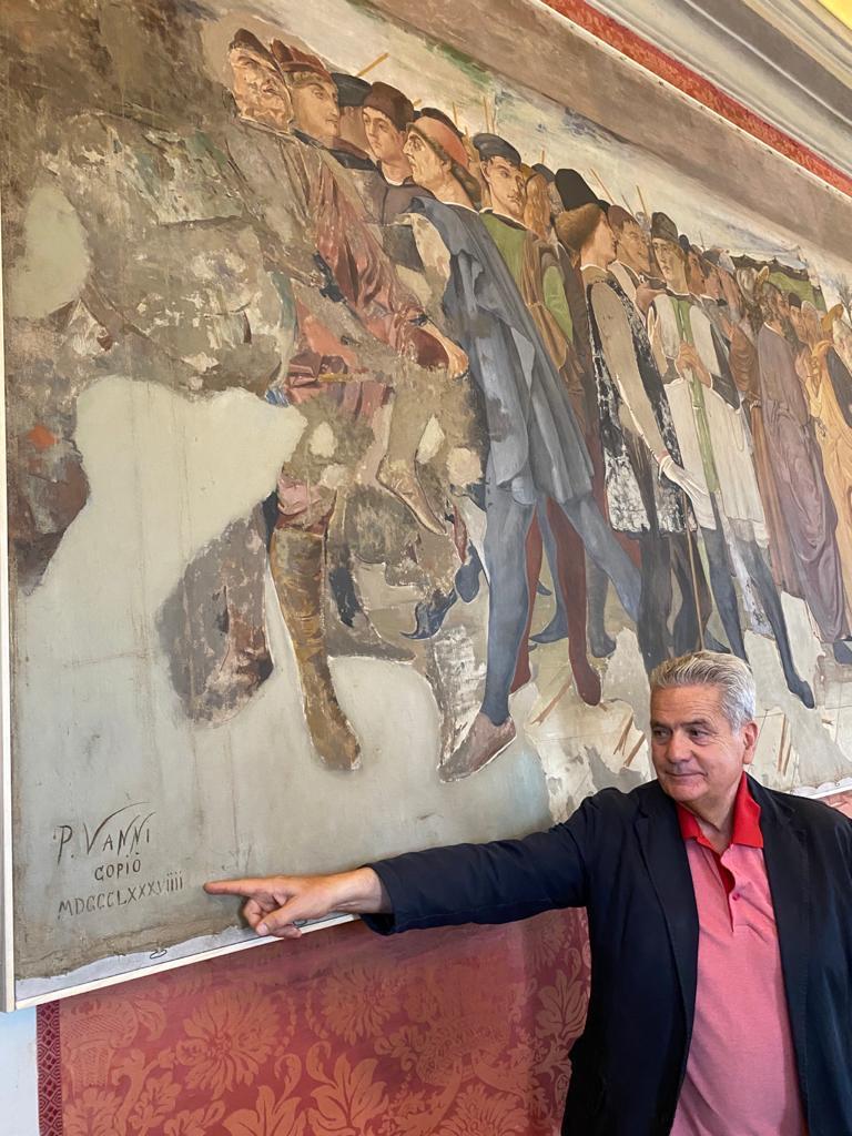 “L’opera di Pietro Vanni – spiega il sindaco Arena – è la copia dell’omonima scena dipinta ad affresco da Lorenzo da Viterbo nella cappella Mazzatosta, all’interno della chiesa di Santa Maria della Verità. Grazie all’interessamento della Fondazione Carivit e a una convenzione tra il Comune di Viterbo e l’ateneo della Tuscia (Dibaf), la tela del Vanni è  stata prelevata da Palazzo dei Priori nel 2019 per essere sottoposta a un intervento di restauro conservativo curato da docenti e studenti del corso di laurea magistrale LM/02, dei laboratori di restauro del DIBAF dell’Università degli studi della Tuscia. Il risultato finale dell’accurato lavoro restituisce tutta la bellezza a una grande opera, realizzata da un artista nostro concittadino, vissuto in un secolo non troppo lontano dal nostro”.
