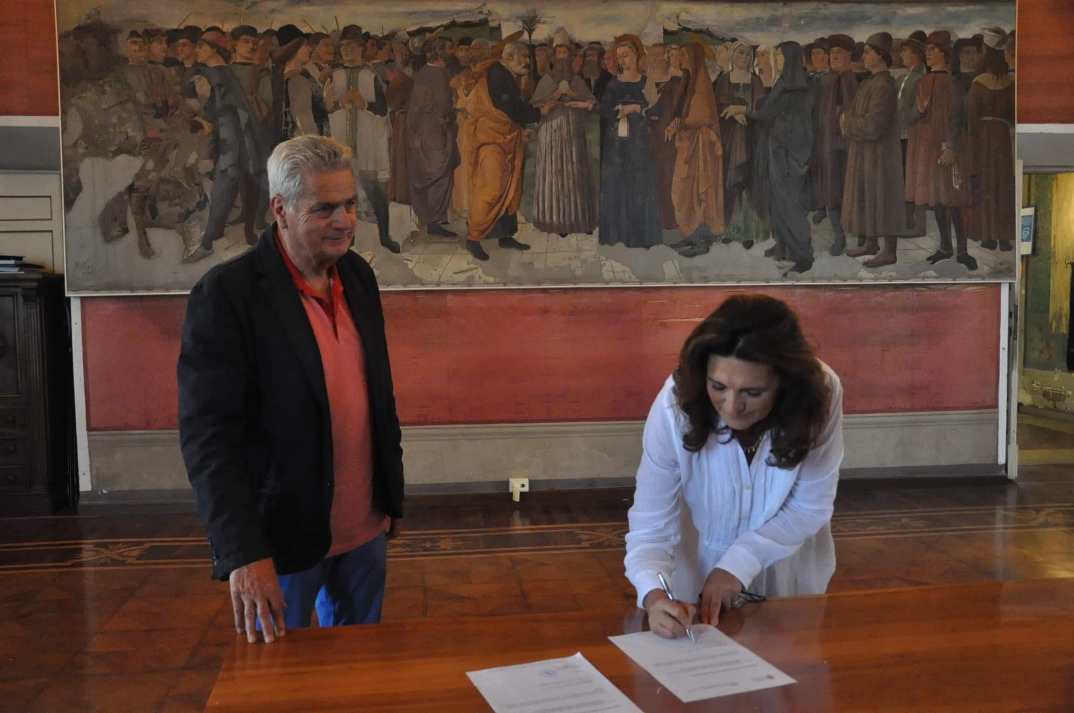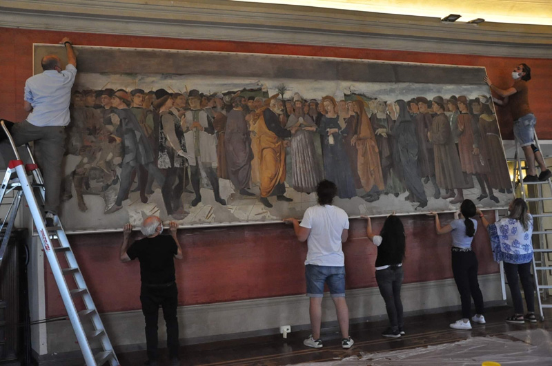 “Lo stato conservativo del dipinto richiedeva un intervento di restauro per le diverse problematiche di degrado in atto – ha spiegato Valentina Fiorito – sia a livello strutturale, come alcune lacerazioni  del supporto tessile, che di pellicola pittorica, ovvero difetti di adesione e depositi di sedimentazioni carboniose. Durante le fasi di smontaggio della tela è stato possibile recuperare la dimensione originale del dipinto (210 x 620cm), riscoprendo la firma dell’autore e l’anno 1889. Considerate le ampie dimensioni dell’opera, per ragioni di collocazione all’interno della sala in un tempo imprecisato, l’estremità sinistra era stata ripiegata di 30 centimetri intorno, al di sotto della cornice”.