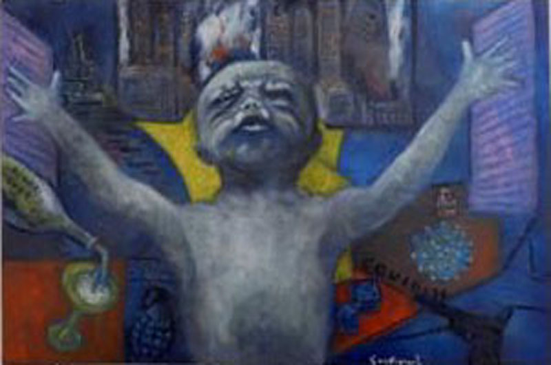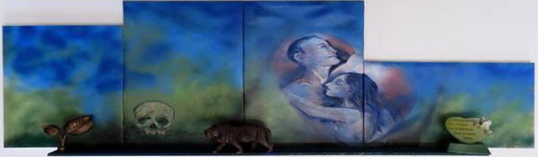 È un’opera che parte dall’antica mitologia della metamorfosi dall’animale all’uomo. Al centro un volto uomo-animale, mutamento che ci fa pensare alla letteratura, film e fantascienze varie. Il Covid-19 sembra più il racconto scaturito dalla mente di uno scrittore o dalla fantasia di un regista, invece è davvero accaduto nel mondo.