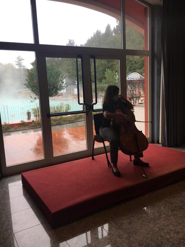 Il Covid ha imposto molte limitazioni fra cui l’impossibilità di sistemare come l’anno scorso la pedana trasparente sulle acque della piscina. Il violoncello se ne sta dunque a bordo vasca con gli spettatori a bagno, emuli dei Violenti dell’Inferno dantesco che  ’nfino a la gola parea che di quel Bulicame uscisse. Ma atmosfera ed emozioni ci sono tutte. Silvia Chiesa esegue tre delle sei Suites bachiane per violoncello solo. La prima, in particolare (BWV 1007),  presenta intensità e invenzioni irraggiungibili per austerità ed effusione che si fanno magici tra i vapori dell’acqua termale.