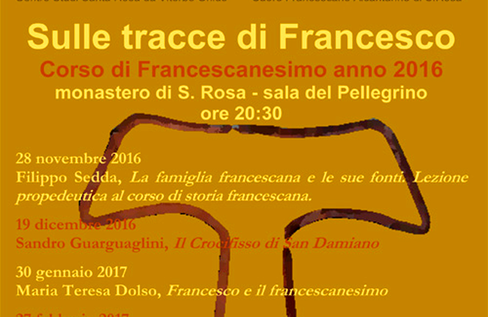 La prima sessione del corso è fissata per il 28 novembre 2016 presso la Sala del Pellegrino del monastero di Santa Rosa da Viterbo, sarà il primo corso di storia del francescanesimo dal titolo Sulle tracce di Francesco.