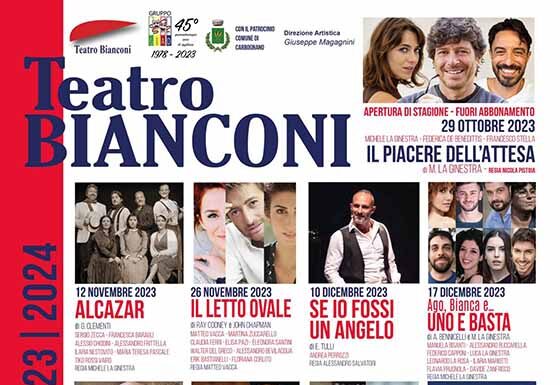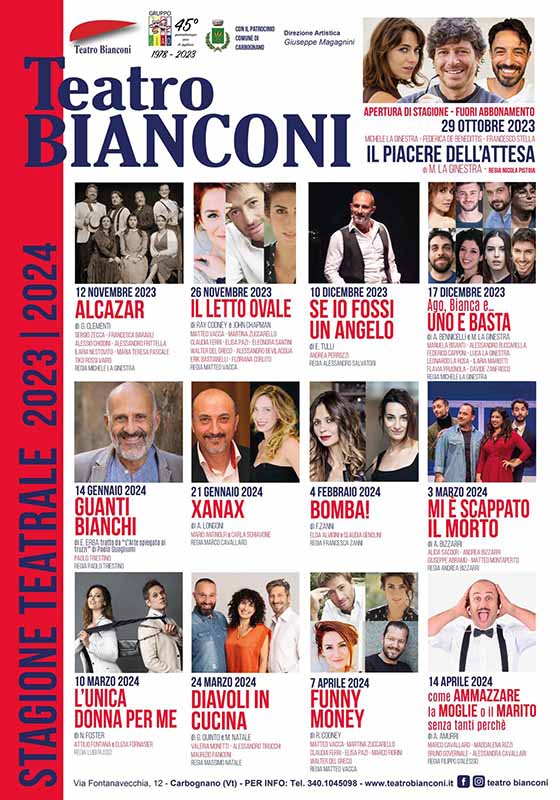 Dopo la Stagione della rinascita, la Stagione dell’eccellenza: il Teatro Bianconi di Carbognano presenta il nuovo cartellone 2023/2024 con ben 12 (+1) spettacoli unici, divertenti, emozionanti, alcuni di nuovissima produzione, che da ottobre ad aprile, vedranno sfilare sulle storiche tavole del palcoscenico viterbese molti dei protagonisti più acclamati della commedia e del teatro nazionale. Impossibile elencarli senza correre il rischio di dimenticare qualcuno, ne citiamo alcuni già noti al pubblico del Bianconi: Michele La Ginestra, Paolo Triestino, Marco Cavallaro, Matteo Vacca, Marco Fiorini, Mario Antinolfi, Ilaria Nestovito, Sergio Zecca, Manuela Bisanti, Francesco Stella, Alessandro Tirocchi, Maurizio Paniconi, Andrea Perozzi, Clizia Fornasier, Attilio Fontana e ancora tanti altri che potrete trovare sul sito del Teatro Bianconi con tutte le date e le notizie relative ad abbonamenti e biglietti. Gli spettacoli proposti rappresentano il meglio della commedia nazionale e internazionale con autori quali Gianni Clementi, Antonio Amurri, Edoardo Erba, Ray Cooney, John Chapman, Andrea Longoni, Andrea Bennicelli, Michele La Ginestra. Attori e autori di eccelsa qualità artistica e talento per una serie di spettacoli che trascineranno gli spettatori in un turbinio di emozioni: dalla risata, alla commozione; dall’ironia, alla riflessione. Nella migliore tradizione della grande commedia di qualità che nel divertimento non tralascia mai di seminare pensieri e proporre angolazioni nuove e sorprendenti sui più importanti temi della nostra società e del nostro tempo.