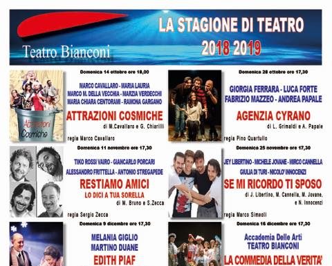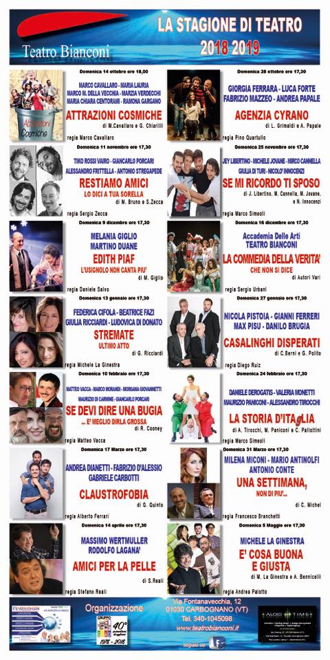 La Direzione Artistica del Teatro Bianconi di Carbognano ha pubblicatoil programma delle attività artistiche della nuova stagione teatrale 2018-2019 con tante novità per festeggiare degnamente due anniversari importanti: i 70 anni del Teatro e i 40 anni dell’Associazione Gruppo GIAD. Era infatti il settembre del 1948 quando, grazie a Mario Liberati, un grande artista di origini carbognanesi che volle donare al proprio paese natio un luogo di svago e divertimento, fu inaugurato il Cine teatro Capriccio (proprio perché nato da un capriccio di artista) poi diventato Teatro Bianconi dopo l’acquisto da parte della Parrocchia locale che ne ha poi curato il più recente restauro. Mentre nel dicembre del 1978, con il primo spettacolo Ciao Natale, nasceva ufficialmente il Gruppo GIAD, che, dopo un lungo periodo di chiusura e decadenza, assunse la gestione del Teatro portandolo, con un lungo e laborioso cammino, ad essere una delle più stabili, longeve e dinamiche realtà culturali del nostro territorio. Nel nome della passione, dell’amore, o se vogliamo del “capriccio” (tutto ritorna prima o poi) per un teatro libero e per tutti. Questi anniversari speciali meritavano un stagione speciale: non uno ma ben due cartelloni. Il primo di 14 spettacoli comici, intensi, entusiasmanti, emozionanti con tante nuove produzioni, talenti di assoluto valore e grandi nomi del teatro italiano. Gli spettacoli inizieranno il 14 ottobre con il grande ritorno di Marco Cavallaro che ha riscosso grandissimo successo lo scorso anno, e si chiuderà il 5 maggio con l’ultimo spettacolo di Michele Ginestra fresco di debutto al Sistina di Roma. Grandi nomi torneranno a calcare le storiche tavole del palcoscenico viterbese: Massimo Wertmuller, Rodolfo Laganà, Marco Morandi, Nicola Pistoia, Max Pisu, le “Stremate” con il loro ultimo capitolo, Milena Miconi, Antonio Conte e ancora tanti altri bravissimi attori impossibili da nominare tutti ma che divertiranno ed emozioneranno il fortunato pubblico del Bianconi con le loro performance artistiche. Nel cartellone non mancherà la nuova produzione della Carpe Diem (società produttiva teatrale nata dall’esperienza del gruppo GIAD) “Casalinghi disperati” con Nicola Pistoia, Max Pisu, Gianni Ferreri e Danilo Brugia con la regia di Diego Ruiz che ha appena debuttato con grandissimo successo al Festival teatrale di Borgo Verezzi, una delle più importanti kermesse teatrali italiane. A questo cartellone se ne affiancherà un altro di 4 spettacoli che, grazie al contributo del Comune di Carbognano, sarà dedicato ai più piccoli dai 4 ai 12 anni, con l’intento di tramandare la passione del teatro anche ai più giovani e avvicinarli a questa meravigliosa forma d’arte che senza telecomandi e joystick, trasmette emozioni, sentimenti, magia, cultura in maniera diretta, senza app, video o smartphone a fare da intermediari. Una comunicazione faccia a faccia, viva, umana che forse non sono più abituati ad usare. La stagione dei piccoli prenderà il via il 2 dicembre per chiudersi il 7 maggio 2019 e vedrà compagnie e attori specializzati per questa particolarissima fascia di spettatori che racconteranno in modo spensierato e divertente le storie di grandi personaggi del passato. Le novità però non finiscono: con l’autunno riparte la Scuola delle Arti del Teatro Bianconi e accanto ai consueti corsi di recitazione, canto moderno e lirico, chitarra, flamenco, inglese e posturale, apre la Scuola di Musical con l’insegnante Laura Leo che ha partecipato alle più grandi produzioni italiane di musical degli ultimi anni. Un grande e ampio ventaglio di spettacoli e attività che avranno come centro il Teatro Bianconi e dal quale nessuno dovrà sentirsi escluso. I prezzi dei biglietti e delle varie formule di abbonamento sono convenienti e pensati per permettere a tutti, con un occhio di riguardo per le famiglie, di partecipare e di godere della magia del teatro. L’organizzazione e le risorse investite nell’allestimento delle attività, sono frutto del lavoro volontario dei soci del Gruppo GIAD Teatro, e dimostrano, una volta di più, che, anche senza budget faraonici ma con competenza e impegno, si può fare dell’ottimo Teatro per tutti anche in provincia. E’ questo il valore aggiunto del Teatro Bianconi dove gli spettatori possono respirare la passione per il libero Teatro, la stessa passione che ha animato e ispirato tutti i 40 anni del Gruppo GIAD. Per informazioni e prenotazioni basta visitare la pagina Facebook del Teatro Bianconi o il sito internet www.teatrobianconi.it oppure telefonare al 340.1045098