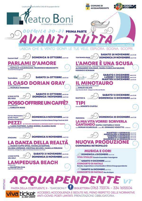 Avanti Tutta. Il Teatro Boni di Acquapendente apre il sipario sulla nuova stagione realizzata dall’Associazione TeBo in collaborazione con il Comune e il sostegno della Regione Lazio. Alla guida, anche in questa edizione, ci sarà Sandro Nardi.