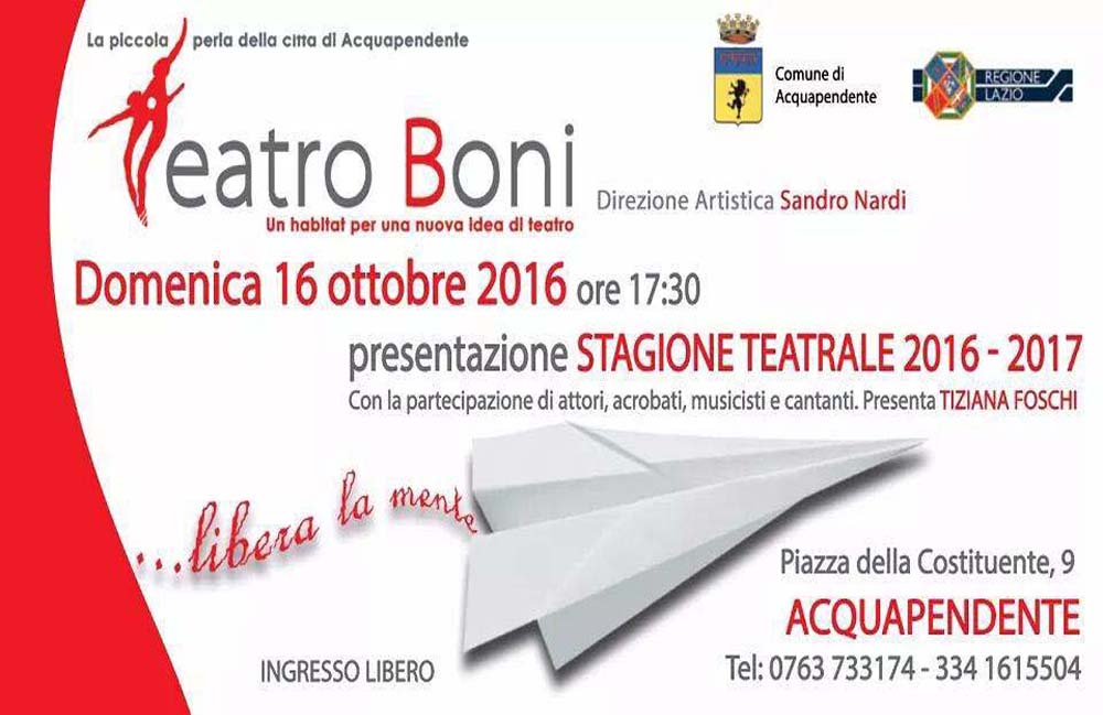 Tornano gli appuntamenti con il Teatro Boni, la piccola perla della città di Acquapendente. La presentazione della nuova stagione teatrale 2016/17 si terrà domenica 16 ottobre alle 17.30 presso il Teatro Boni.